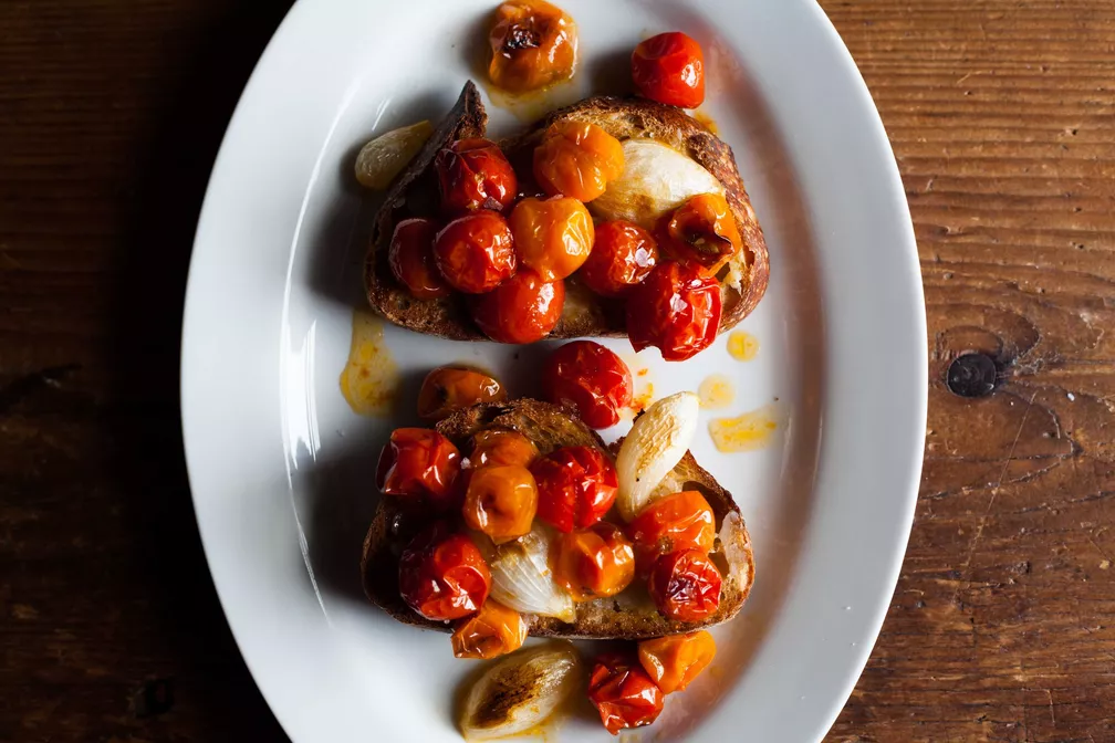 The inspiration for this recipe came from the treasure trove that is The Smitten Kitchen Cookbook. Deb Perelman’s perfect union involves cipollinis and mini-Romas together, poured over toast with white beans for heft. Mine involves sungolds and cherry tomatoes bathed in olive oil, spring onions instead of cipollinis (I’m too lazy to peel the latter), and husky cloves of garlic roasted alongside the whole mess, to be spread on the toast like butter. Instead of the beans, to make it a meal, I eat seconds.