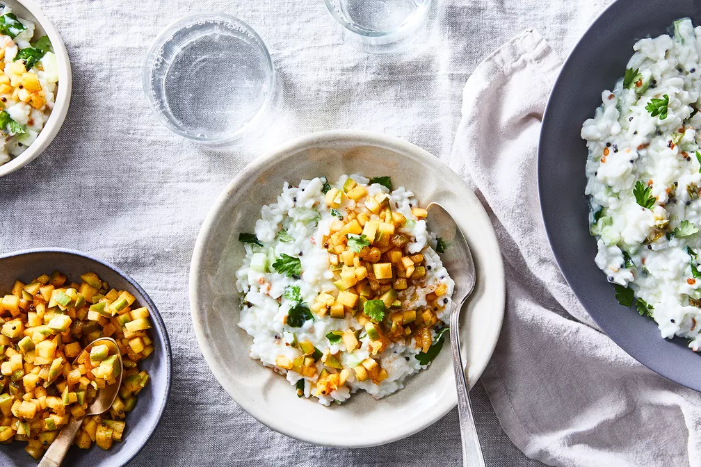 There is comfort in knowing that as long as you keep yogurt, rice, and spices on hand, you can always feed yourself and your family dinner. The recipe is pictured here with Padma Lakshmi's Green Mango Curry. If you don't have the spices on hand, try a local spice shop or Indian grocery, or order them from Kalustyan’s, a beloved New York institution and one of author & Top Chef host Padma Lakshmi’s favorite stores), but it’s also okay to work with what you have. If you can't find urad dal, an Indian white gram lentil, for example, Lakshmi recommends frying cashews for a similar nutty crunch.