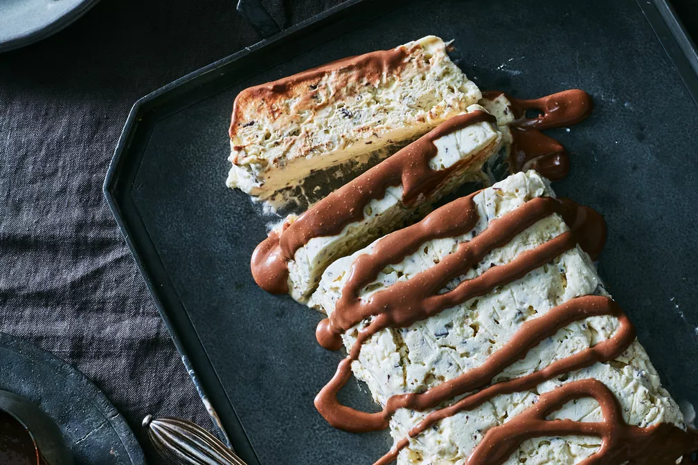 Much of the wonder of this dessert may lie in its semihomemade ease—you’re doing little more than bashing up store-bought meringues and folding them into whipped cream. But this gelato cake comes from quite literary roots, reminding us that we should be open to finding cooking inspiration in all sorts of places: dusty books at estate sales, our elders’ recipe boxes, or the yellowed clippings that flutter out of an old birthday card. In this case, it did help that Nigella Lawson could read Italian.