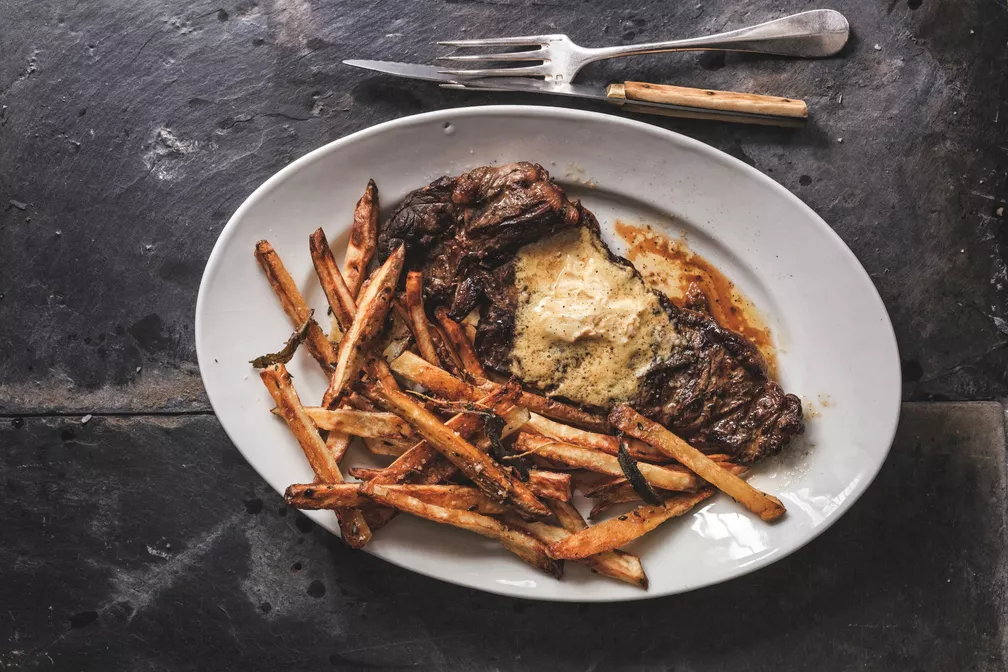 To make this bistro classic in my kitchen, I use a cast-iron skillet or grill pan that I get really hot, and then I sear the steak on both sides, cooking it medium-rare, which is the way I like it. My preferred cut is entrecôte, or rib-eye, and I ask the butcher to cut it into steaks that aren’t too thick since I like lots of surface area on my steaks. I rub them with chipotle chile powder to give them a bit of a smoky flavor.