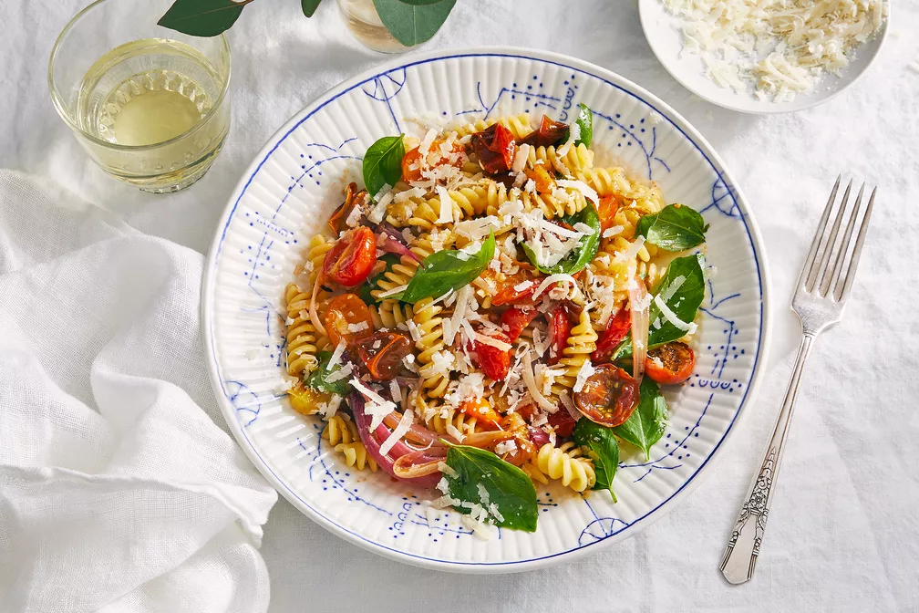 My boyfriend and I have been making this simple yet extraordinarily delicious pasta for almost a decade. It's especially perfect during the summer when tomatoes are juicy and ripe, though I've been known to make it in the dead of winter when I need a kick of bright, fresh flavor. To this day we still don't know exactly who invented the recipe, but it was likely inspired by a Jamie Oliver dish (old Naked Chef episodes are regularly rewatched in this house). The magic comes from the balsamic vinegar and a single sheet pan: the tangy acidity of the balsamic sweetens as it caramelizes the tomatoes and onions, while the aluminum foil-wrapped garlic softens and mellows as they all roast together in the oven. In fact, this recipe is one of the few reasons to turn on your oven during the hottest months of the year—you just can't get that same level of sticky-sweet goodness on the stovetop. (The easy cleanup doesn't hurt either.)