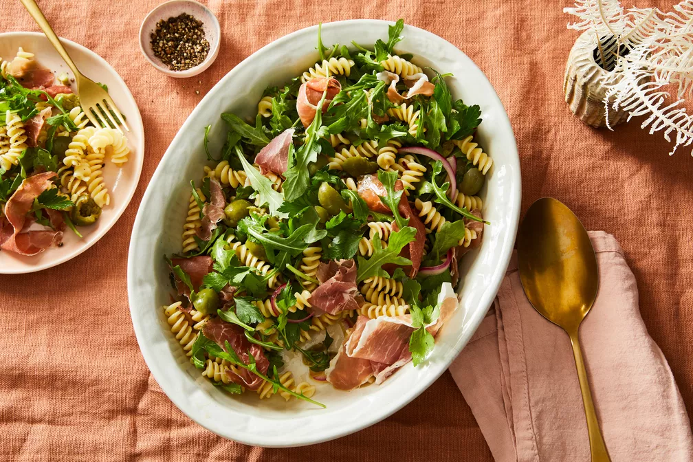 Search for “pasta salad” on the internet, and you’ll see a rainbow of ’sta-lads out there. To Anna Billingskog, our Italian-American food stylist with very strong feelings on Italian-American food, pasta salad means “corkscrew pasta, cubed deli meat butts, and a red wine vinaigrette.” To Trevor, my partner, it requires mayo and diced hard-boiled eggs. To me, it means all of my favorite things in one bowl: buttery olives, salty meat ribbons, bouncy bocconcini, and leafy parsley.