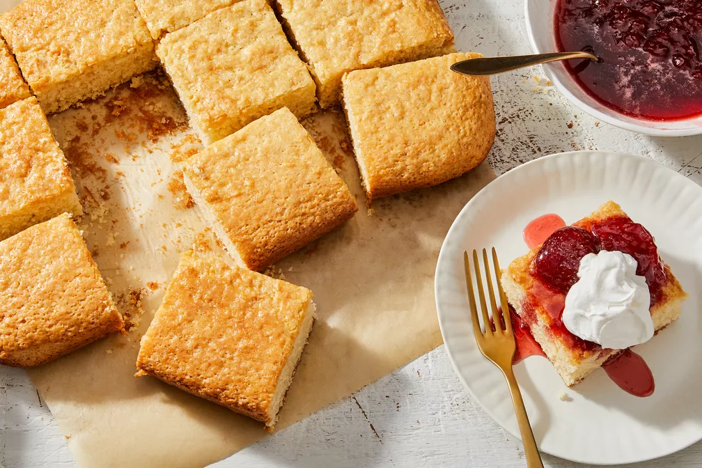 Pastry chef Jami Curl wanted the simplest possible vanilla cake to stir together at home—one that, without a mixer, you could be eating warm from the oven in under an hour. Her latest cookbook Baking Gold has lots of ideas for dolling it up with fruit and glazes and crunchy bits (pictured here: jammy strawberries and butterscotch whipped cream). And in Genius trick news: It keeps well days longer than your average cake—so you can try lots of them. Sprinkle fruit on top or stir it through before baking (Jami loves frozen blueberries, and says blackberries would also be good, but will bring a bit of extra moisture). After baking, top it with anything you’re in the mood for: Buttercream and sprinkles for a birthday cake. Toasted coconut, grated chocolate, spiced nuts. More sour cream, fresh fruit, and a sprinkle of brown sugar. And ice cream would never be a bad alternative (or addition!) to the whipped cream.