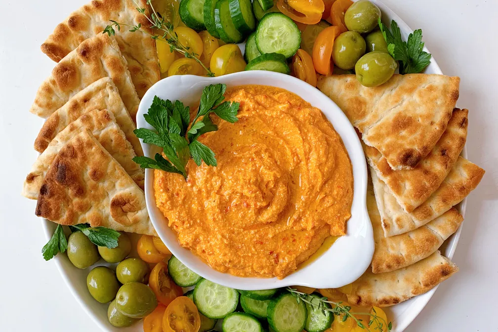 An homage to the Greek dish Htipiti, this whipped feta dip with roasted red peppers is the perfect balance of tangy and savory. With only five main ingredients, this simple dip is easy to make for any small gathering as an appetizer! Try pairing this with toasted pita, fresh crudités, and marinated olives.