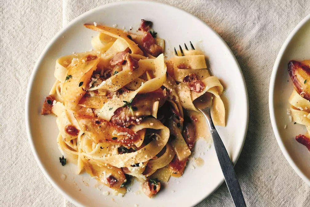 Sam Sifton’s Pasta with Parsnips & Bacon is a rich, savory fettuccine dish where crisped bacon (or pancetta) mingles with caramelized parsnips, garlic, butter, thyme, and Parmesan—tossed in reserved pasta water to form a glossy, comforting sauce
