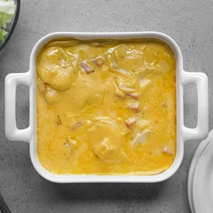 Hearty salmon steaks smothered in a rich cream sauce filled with sautéed vegetables. Filling, flavorful, and comforting—perfect for a full meal on one plate.