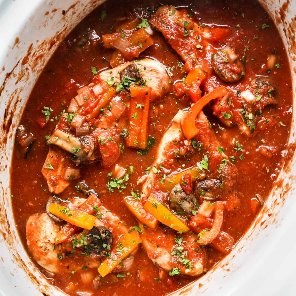 Chicken simmered in a seasoned tomato sauce with herbs and vegetables. Simple, healthy, and great over rice or pasta.